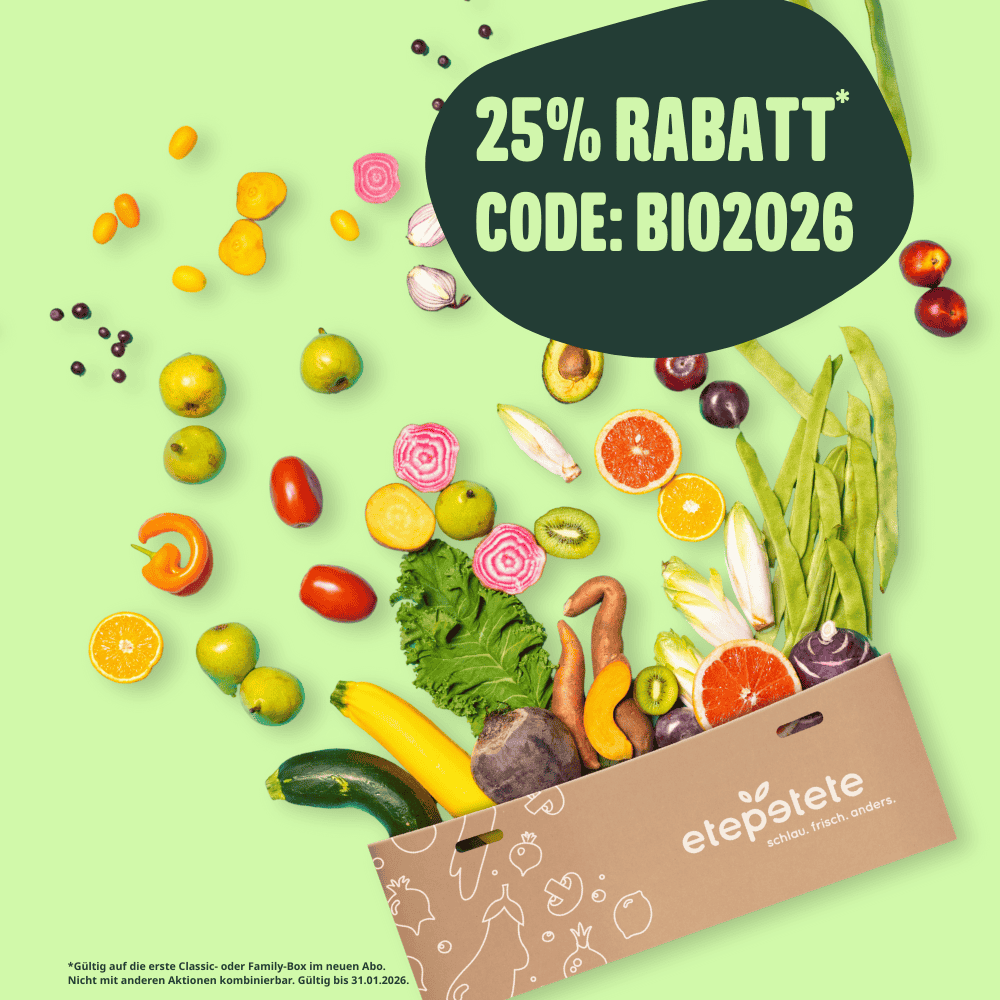 Neues Jahr, neue Möglichkeiten für frische Vorsätze! Hol dir deinen Vitamin-Kick. Deine Box ist vollgepackt mit frischem, leckerem Obst und Gemüse von Bio-Landwirt:innen – ganz egal ob krumm oder schief.
